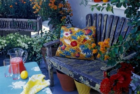 Prostor je podeljen na tri celine različite namene, pa tako je ispod nadstrešnice kutak za sedenje, druženje i obedovanje. Uz kuću su postavljene žardinjere sa cvecem. Deo za sunčanje i uživanje čine dva ligeštula.