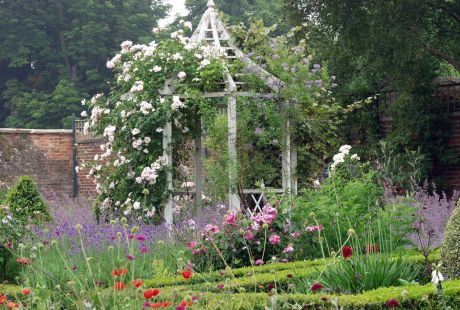 Desno u istom nivou je klupica, iznad koje je luk s belom ružom puzavicom. Između i gore, na višem nivou, rastu razni šibovi smaragdnozelene boje ili sa zeleno-belim lišćem, ali s dekorativnim cvetovima u vidu belih lopti (viburnum).