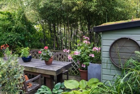 Ova prilično velika rondela je bogata biljkama koje su gusto posađene. Tu je i ružičasta astronacija, divan šib oštrozube spiree ili suručice, crno-crveni ukrasni slez koji se naslanja na deo gde su naslagana drva. Kao što se vidi, taj elemenat vrta u kome se nalazi kompost i pored njega gotovo ukrasno složena drva, deluje veoma šarmantno.