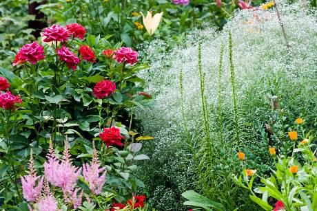 Stanište bi trebalo da je sunčano, a zemlja bogata humusom. Ono što vam je za to potrebno jeste slobodna površina od otprilike devet kvadratnih metara (3x3 m). Glavnu ulogu igraju mirisne ruže: „Elbflorenz”, „Eliza” i „Kosmos”. Njima su se pridružili visoki pratioci kao što su beli žavornjak – označen brojem 2 na fotografiji (sorta „Galahad”), veliki zvezdasti štit (Astrantia mayor) – pod brojem 4 i penisetum (Pennisetum „Hameln”) – označen brojem 3.
