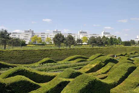 A ono što je zaista nesvakidašnje jeste to što se do nje dolazi talasastom površinom prekrivenom šljunkom. Ne zaboravite da ukoliko hoćete komotno da se šetate, izaberete sitniji šljunak. Još jedan elemenat, koji se veoma retko sreće a vrlo efektno izgleda, jeste talasasto ošišana živa ograda od šimšira, uz koju su posađeni cvetni žbunovi. A sedite i uživate u drvenoj garnituri na ravnoj šljunkovitoj površini koja se naslanja na besprekoran travnjak. Loptasto ošišane tise uz mnoštvo raznobojnih perena i ukrasnih trava krase ovu pejzažno rešenu baštu.