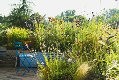 Ljubičasti geranijum tik uz terasu formira cvetni tepih tokom leta, u junu i julu. U isto vreme cveta bakljasti ljiljan, a plave loptice ehinopsisa dopunjuju divnu sliku. Hiperikum, šib sa žutim cvetićima, cveta od jula do oktobra, dok mu lišće na granama ostaje i preko zime na granama. Živa ograda je veoma interesantna, sastavljena od lovor-višnje i ukrasne trave koja poraste 1 metar uvis (Panicum). Skicu bašte kao i spisak biljaka možete pogledati na slikama u galeriji.