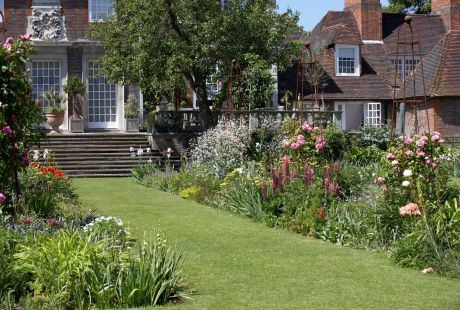 Uza sam zid kuće rastu visoke perene poput delfinijuma, sleza, digitalisa i roze lupine. Ispred njih su žuti virak i hajdučka trava, koji čine lep kontrast u odnosu na prethodne biljke. Kako između cveća ispred kuće i mirisnih žbunova uz ogradu prolazi travnata staza, našlo se mesto i za rustičnu klupu za uživanje, na granici prema susedima. Iza nje su stubaste kruške koje pružaju ugodan hlad. Veoma je zanimljiva i staza koja vodi od ulaza u baštu do kuće kombinovana ob belih ploča i granitnih kocki.