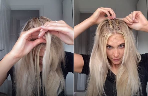 Puštenu kosu razdelite na sredini, a onda s glavom spuštenom prema napred od pramenova na prednjem delu ispletite dve tanke, jednostavne pletenice. Kada to uradite pletenice prebacite unazad i gumicom pričvrstite zadnji deo kose, pa ceo postupak ponovite s drugom stranom.