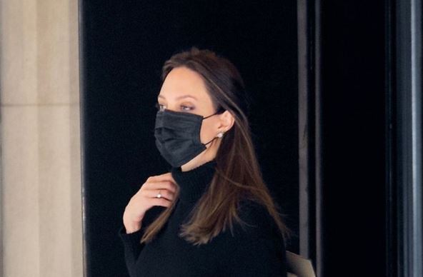Anđelina je ponela crnu rolku dugih rukava, u kombinaciji s suknjom A kroja koja dosezala iznad članaka. Ovaj model istakao je glumičinu ženstvenu siluetu, a crne salonke upotpunile su ovu elegantnu kombinaciju.