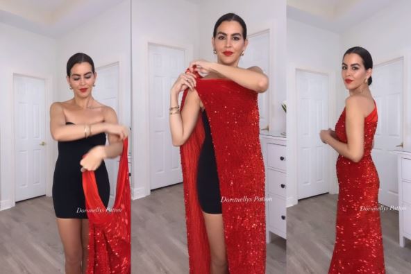 Sad je Doranelis pokazala kako od jednog komada mekanog žerseja može da se napravi haljina za Novu godinu. Pronašla je divnu crvenu likru sa šljokicama, sličnu materijalima kakvi se mogu naći u prodavnicama metraže "na kilo".