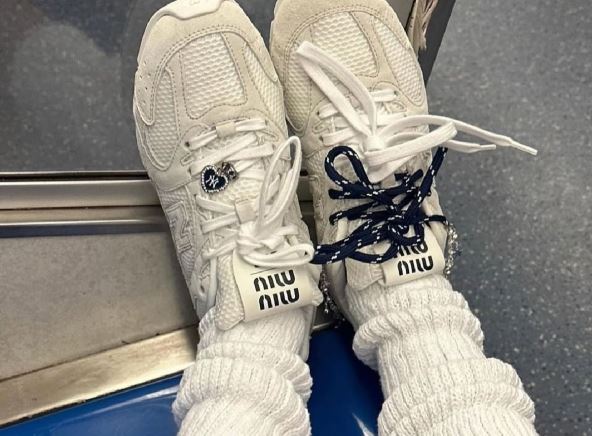 U međuvremenu, Miu Miu je ostao dosledan svom prepoznatljivom estetskom rukopisu, predstavljajući patike sa efektom nošenog, kožnog finiša, koje su stilizovane uz kontrastne čarapice do članaka – detalj koji unosi dozu mladalačke razigranosti i ležernosti.