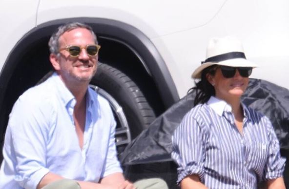 Megan je, naime, pratila polo utakmicu u Santa Barbari i navijala za svog supruga Harija, a tom prilikom nosila je crni šorts, plavu košulju sa belim prugama i beli sako.