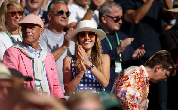Preko suknje je imala zanimljivu plavo-belu dužu bluzu bez rukava, obavezni šešir i - njen zaštitni znak ovog leta - skupocenu Dior torbu. Sin Stefan i ćerka Tara su je pratili u šetnji niz ulicu u kojoj su smešteni tokom popularnog engleskog turnira.