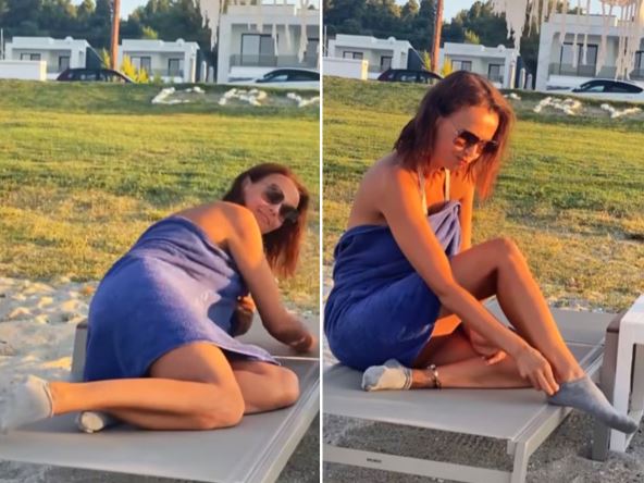 Voditeljka uživa na moru, a beli bikini je istakao njeno savršeno preplanulo telo. Ipak, nije propustila priliku da se našali na račun svojih godina, pa je objavila video sa plaže, na kom se vidi da nosi čarape.