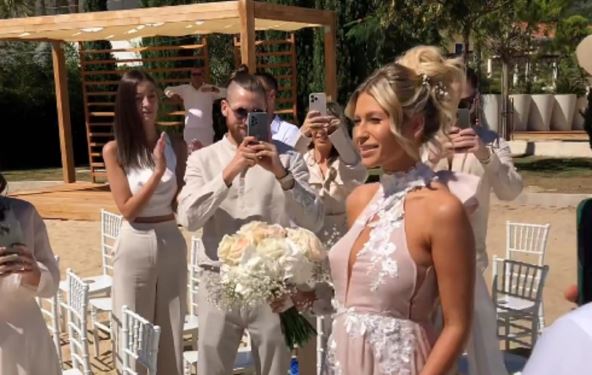 Tokom romantične ceremonije mladenci su bili bosi, a Đorđe je u bež odelu čekao Sašku, koja je do oltara došetala u lepršavoj beloj haljini, noseći bidermajer u ruci.
