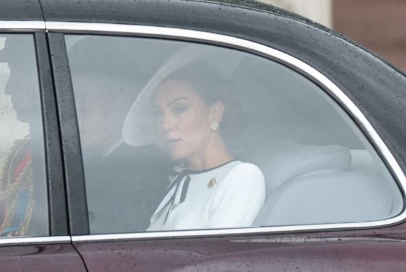 Premda je prethodnih godina, na paradi povodom kraljevog rođendana, Kejt bila u otvorenoj kočiji, sada je vidimo u zatvorenom automobilu. Sa njom su Vilijam i deca, a budući prestolonaslednik princ Džordž sedi između oca i majke.