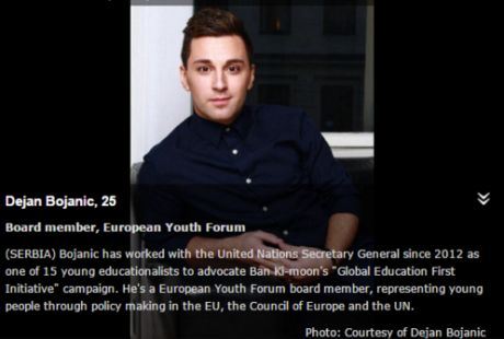 — Dejan Bojanić (@bojandejanic) January 19, 2016 Iako njegove studije još uvek traju u Beogradu, jedan od najuticajnijih ljudi, koji su mlađi od 30 godina, trenutno radi u Stokholmu, u organizaciji koja se bavi zaštitom dečijih prava, a koja je poznatija pod nazivom " Spasimo decu".