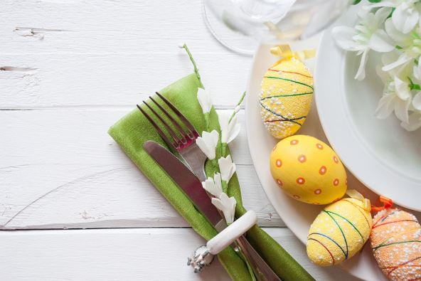 Na stolu stoji ukrašena činija sa ofarbanim jajima.