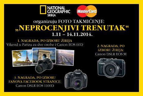 Foto takmičenje „Neprocenjivi trenutak“ odvijaće se u periodu od 1. do 14. novembra 2014. godine, a najbolje fotografije po izboru stručnog žirija i fanova ove Fejsbuk stranice očekuju sjajne nagrade. Svaki takmičar će moći da prijavi jednu fotografiju na takmičenje, a autora pobedničke fotografije po izboru stručnog žirija, kompanija MasterCard nagradiće vikend putovanjem u Pariz za dve osobe i fotoaparatom Canon EOS 60D, a on će takođe dobiti i godišnju pretplatu na časopis National Geographic Srbija.