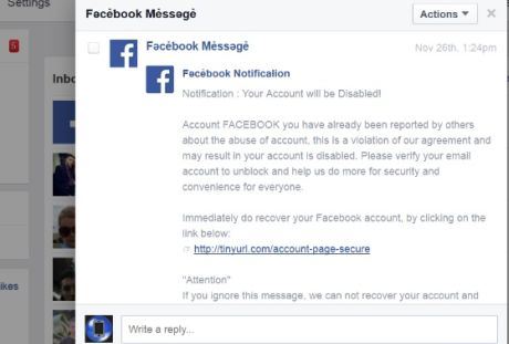 Tekst poruke koja dolazi u Inbox FB naloga upozorava da je vaš nalog isključen zbog uznemiravanja drugih korisnika i da je potrebno, preko linka koji je u poruci, ponovo aktivirati nalog.