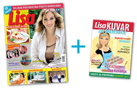 U novom broju magazina Lisa koji je u prodaji od 21. juna 2013.godine očekuje vas buklet na 16 strana Lisa Kuvar za početnike. Za one koji nisu vični u kuvanju ovo je idealna prilika da sve najvažnije recepte nađu na jednom mestu i oprobaju se u receptima za početak dana, lake večere, kolače koji se spremaju za 15 minuta i još mnogo toga.