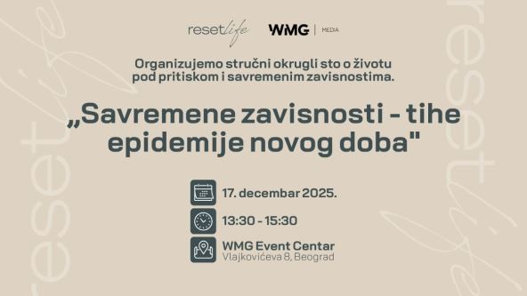 Kompanija WMG (Wireless Media Group) organizuje okrugli sto "Savremene zavisnosti – tihe epidemije novog doba", koji će biti održan 17. decembra 2025. godine u WMG Event Centru, s početkom u 13.30 časova.