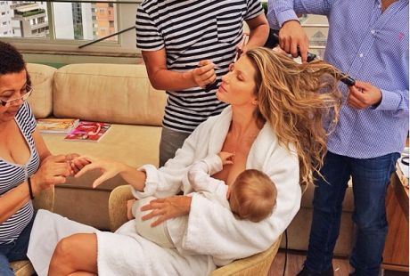 Na slici je prelepa brazilska manekenka koja, u trenutku dok joj uređuju lice, nokte i frizuru - sklopljenih očiju - doji svoju ćerkicu Vivijen.