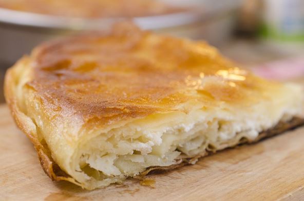 Preklopiti dve kore koje vire sa dna tepsije, pa prekriti dvema korama odozgo.