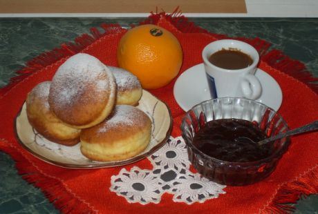 Priprema: U mlako mleko rastvorite kvasac i šećer. U drugi sud prosejte brašno, dodajte nadošlii kvasc, so, sok i malo rendane kore od narandže, jaja i zamesite testo. Pokrijte krpom i ostavite na toplom da se udvostuči. Nadošlo testo premesite, razvijte oklagijom na debljine 1 cm i vadite čašom krugove. U zagrejano ulje pržite krofne sa obe strane da porumene. Gotove krofne vadite na salveti da upiju višak masnoće. Pospite šećerom u prahu i poslužite sa džemom i kafom... Prijatno.