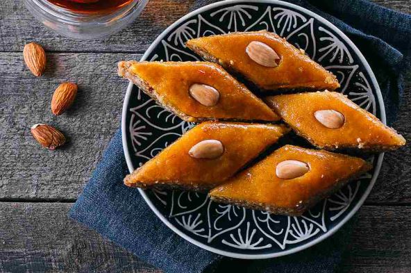 Pečenu lažnu baklavu iseći na kocke ili rombove pa preliti ohladjenim sirupom, a limun poslagati odgore.