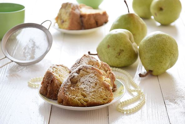 Izmešajte masu od jaja i šećera sa brašnom, dodajte kruške i đumbir.