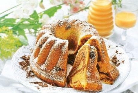 Kolač pecite u rerni 60-70 minuta. Onda ga izvadite, ostavite da se hladi u kalupu 20 minuta. Iskrenite ga na rešetku za kolače da se ohladi do kraja. Pre posluživanja pospite ga šećerom u prahu, kakaom i seckanom čokoladom.