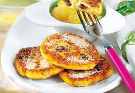 Suvo grožđe natapajte u vrućoj vodi oko 5 minuta. Krompir oljuštite i sitno narendajte. Na rendani krompir prosejte brašno i prašak za pecivo, na to propasirajte sir. Razmutite jaja, začinite ih solju, muskatnim oraščićem, limunovom korom i vanilin šećerom. Suvo grožđe dobro ocedite, lagano pospite brašnom, dodajte zajedno s jajima krompiru i umesite glatko testo.