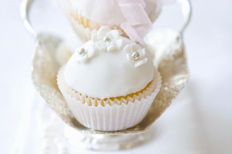 Izmiksujte maslac, šećer i vanilu najmanjom brzinom. Dodajte jedno po jedno jaje sve vreme mešajući mikserom. Prosejte zajedno brašno, badem, sodu bikarbonu, prašak za pecivo i so, pa dodajte smesi s maslacem i jajima naizmenično s kondenzovanim mlekom, u tri navrata. Pecite u kalupima za mafine oko 25 minuta na 200 stepeni. Ohladite. Za krem pomešajte maskarpone s maslacem i vanilom, dodajte otopljenu belu čokoladu i promešajte da se smesa poveže. Svaki mafin premažite ovim belim kremom i ukrasite svežim voćem po izboru.