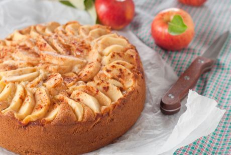 1. Rernu zagrejte na 180 stepeni. Jabuke oljuštite, presecite na četiri dela, uklonite im semenke, a zaobljene strane više puta zasecite. Nakapajte limunovim sokom. Okrugli kalup (precnika 26 cm) obložite papirom za pečenje.