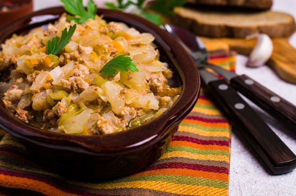 Dolijte malo vode i zagrejte da provri, a onda polako mrvite mlevenu junetinu prstima i tako je spuštajte u kupus koji se kuva.