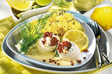 Vlašac ili mladi luk naseckajte i propržite na vrućem puteru. Dodajte bujon i pavlaku, pa pustite da se krčka oko 5 minuta. Dodajte riblje rolnice, na laganoj vatri ih krčkajte 15-18 minuta. Onda ih izvadite, sos zgusnite gustinom koji ste razmutili u malo hladne vode. Krompir propasirajte i poslužite uz rolnice sa renom, šunkom i umakom.