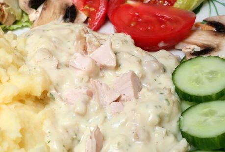 Priprema: Na malo ulja propržite sitno seckan beli luk na srednjoj temperaturi. Dodajte brašno i promešajte, nalijte supom i mlekom. Mešajte dok se ne zgusne. Dodajte sirće ili sok od limuna i po potrebi još mleka ili supe. Začinite solju i biberom. U gotov sos dodajte meso skuvano za supu i iskidano na veće komade.
