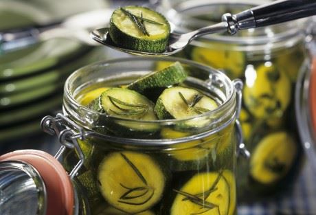 Izvadite iz sirćeta , ocedite i složite u čiste tegle. Nalojte uljem tako da tikvice budu sasvim pokrivene i idućih nekoliko dana proveravajte da li treba da dosipate. Zatvorite hremetički i sterilišite pola sata u zagrejanoj rerni.