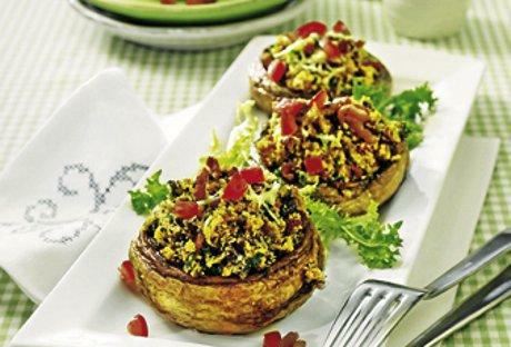 Slaninu iseckanu na kockice propržiti na tiganju, tako da postane hrskava, pa je izvaditi na kuhinjski papir da se ocedi. Opranim šampinjonima odrezati peteljke i iseckati ih na kockice, a šeširiće prodinstati 1 minut na masnoći od slanine. Potom ih staviti u namašćenu vatrostalnu posudu, s udubljenjem prema gore, posoliti i pobiberiti.