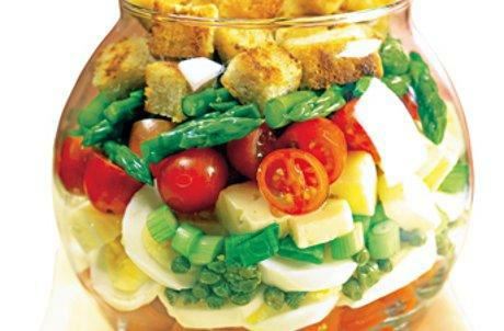 Jaja tvrdo skuvajte, oljuštite ih i isecite na kolutove. Šparglu očistite, kuvajte u posoljenoj vodi 8 minuta, pa je nasecite na manje komade. Paradajz presecite popola, mladi luk nasecite na kolutiće, a sir i papriku na kockice. Umutite 4 kašike ulja, sirće, malo soli i bibera. Hleb nasecite na kockice i jače popržite na 2 kašike ulja. U užu činiju slažite redove povrća, jaja, kapar, sir, zatim prelijte sosom i na kraju stavite sloj proprženih kockica hleba (krutona).