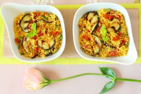 Kus-kus stavite u veliku činiju i zalijte kašičicom i po ključale vode. Nakon desetak minuta izmešajte kus-kus viljuškom. U veliki tiganj stavite dve kašike ulja, pa prodinstajte luk isečen na tanke ploške. Patlidžan isecite na tanke šnite, pa na trouglove, a onda pomešajte sa kuminom, isitnjenim belim lukom, cimetom, paprikom , karanfilićem, biberom i ½ kašičice soli. Dodajte još ulja u tiganj, pa pecite patlidžan dvadesetak minuta. Izvadite i ostavite da se ohladi. U istom tiganju otopite puter, pa kus-kus kratko prodinstajte. Dodajte luk, patlidžan i beli luk. Poslužite ohlađeno.