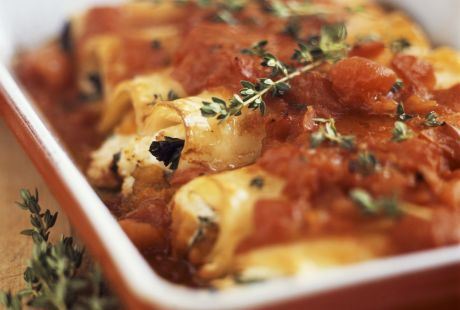 Mocarelu ocedite i nasecite na tanke listove. Pecivo zgnječite i iscepkajte. Pomešajte s mlevenim mesom, jajetom, preostalim lukom, belim lukom i origanom. Posolite i pobiberite. Kanelone nafilujte smesom, stavite ih u podmazan pleh, po njima rasporedite mocarelu i sos od povrća i pecite oko 35 minuta.