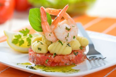 Opran paradajz isecite na kockice, očišćen luk naseckajte. U tiganj na 2-3 kašike ugrejanog maslinovog ulja stavite luk, paradajz, izgnječen beli luk, mešavinu začina,i pržite na laganoj vatri 2-3 minuta. Ulijte belo vino, posolite i kuvajte 5-6 minuta. Potom u tiganj dodajte repove kozica, a u lonac s vrelom i posoljenom vodom dodajte njoke i sve zajedno kuvajte dok njoke ne isplivaju na površinu. Posle 2-3 minuta kuvane njoke ocedite i dodajte u tiganj sa sosom, pa sve sastojke izmešajte.
