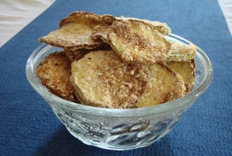 Tikvicu isecite na tanke kolutove. Kolutove tikvice posolite i ostavite 30 minuta da odstoje u soli. Pomešajte susam, kukuruzno brašno i suvi začin. Odstojale kolutove ocedite. Svaki kolut uvaljajte sa obe strane u smesi susama, brašna i začina. Potom kolutove ređajte u tepsiju obloženu papirom za pečenje. Pecite 15 minuta na 200ºC. Okrenite drugu stranu kolutova. Pecite još 5 minuta.