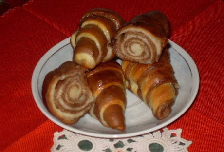 Priprema: Kvasac rastvorite u mlako mleko sa kašičicom šećera. Dodajte prosejano brašno, malo soli, ulje, omekšali margarin i zamesite testo. Testo podelite na dva dela, u jedan stavite kakao i dobro izmešajte, a drugi ostavite beo. Ostavite testo na toplom da se udvostruči. Pojedninačno razmesite testo i razvijte oklagijom na iste veličine i poklopite jednu preko druge. Isecite testo nožem na trouglove – što više trouglova (koliko obim testa dozvoljava).