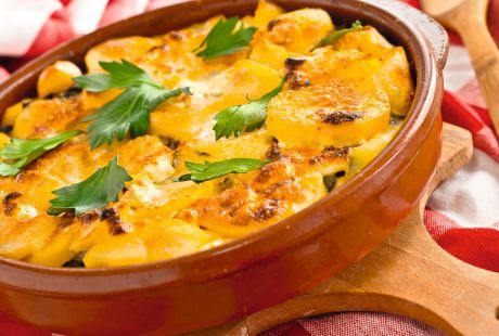 Rernu zagrjte na 200 stepeni i podmažite tepsiju. Za sos ulupajte jaja sa slatkom pavlakom, pa umešajte 80 g gaude i začinite solju, biberom i muskatnim oraščićem. Polovinu krompira, kuvanog povrća i peršuna naizmenično poslažite u tepsiju, svaki sloj posolite i pobiberite. Prelijte polovinom sosa od jaja i sira. Nastavite s naizmeničnim ređanjem i začinite po ukusu. Prelijte preostalim sosom i pospite preostalim sirom. Odozgo rasporedite komadiće putera i slanine, pa pecite u rerni oko 40 minuta.