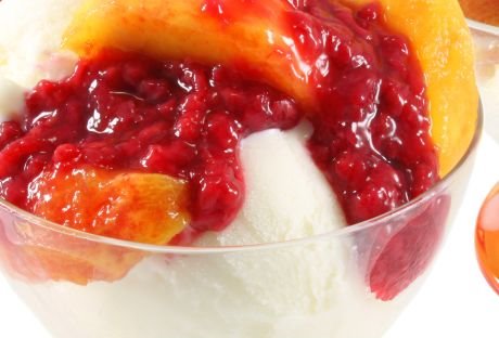 U svaku čašu stavite polovinu breskve, a u udubljenje breskve sladoled. Propasirajte maline, dodajte prah-šecer i malo limunovog soka, propustite kroz cediljku (da odstranite koštice) i time prelijte sladoled. Na vrh stavite šlag umućen s vanilin-šećerom. Poslasticu servirajte u čašama s dugačkom stopicom.