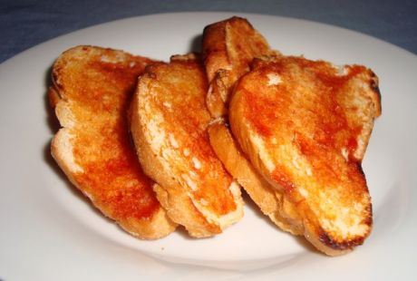 Pomešajte ulje i kečap. Dodajte sitno isjeckan beli luk. Dobijenom masom premažite obe strane kriški hleba. Namazane kriške ređajte u nauljenu tepsiju tako da se naslanjaju jedna na drugu. Pecite kriške 10 minuta na 250ºC. Okrenite drugu stranu kriški i pecite još 5 minuta.