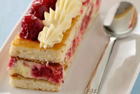 Ostatak malina kuvajte pet minuta, pa umešajte sok od limuna i šećer u prahu. Kolač premažite preostalom ulupanom slatkom pavlakom i ukrasite prelivom od malina.