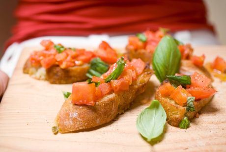 Očistite režnjeve belog luka i po širini ih prepolovite. Sa otvorenom stranom pređite preko svake kriške hleba. Svaku krišku pokapajte maslinovim uljem i stavite preko paradajz koji ste prethodno nasekli na komadiće, posolili, pobiberili, i pomešali sa svežim začinskim biljem.