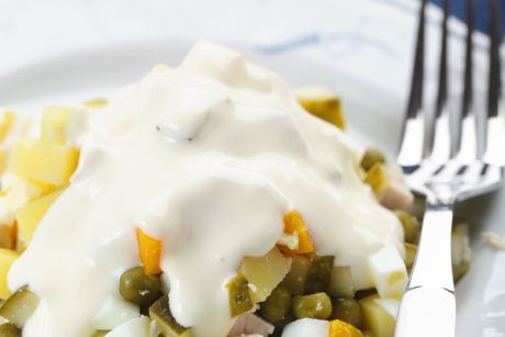 Iseckajte povrće i krastavčiće na kockice. Promešajte i dodajte soja majonez. Dobro izmešajte varjačom. Salata ne treba da bude ni suviše suva a ni retka, što možete da regulišete količinom majoneza.
