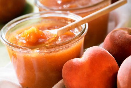 Breskve operite, oljuštite i očistite od koštica i oštećenih delova i isecite. Poprskajte ih limunovim sokom da ne potamne. Stavite ih u lonac, dodajte sitno naseckan ušećereni đumbir i pospite sredstvom za pripremu džema pomešanim s delom šećera (prema upustvu). Lonac stavite na srednje jaku vatru. Kad mešavina provri, stavite šećer i mešajte dok se šećer ne rastopi. Pustite da ponovno provri, a zatim kuvajte još 3 minute. Sklonite sa vatre i skinite penu pa napunite vruće sterilizovane tegle.