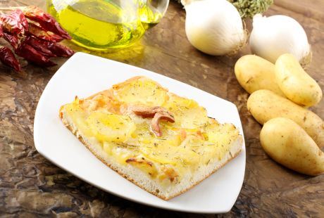 Oljuštite beli luk, izgnječite ga i propržite na ulju. Umešajte origano i sklonite sa vatre. Oljuštite kuvani krompir i uzduž isecite na tanke ploške. Rernu zagrejte na 200°C. Obložite dva pleha papirom za pečenje. Testo podelite na dva dela i oklagijom istanjite na dva kruga. Stavite ih na plehove i tanko pospite rikota sirom. Odozgo poređajte krompir i pospite maslinke. Poprskajte uljem, pospite parmezanom i pecite u rerni oko 20 minuta. Zatim isprskajte preostalim uljem, pospite morskom solju i garnirajte origanom. Servirajte toplo.